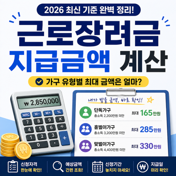 근로장려금 지급금액 계산은 단순히 최대 금액만 보고 판단하면 안 됩니다. 본인의 가구 유형, 소득, 재산 기준을 함께 따져야 실제 받을 수 있는 금액을 알 수 있습니다. 특히 단독가구는 최대 165만 원, 홑벌이가구는 최대 285만 원, 맞벌이가구는 최대 330만 원까지 받을 수 있지만, 최종 금액은 심사 결과에 따라 달라질 수 있습니다.